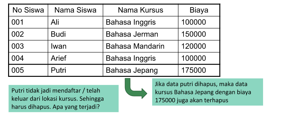 Anomali Penghapusan terjadi apabila ada suatu tupel yang tidak terpakai dihapus mengakibatkan adanya data lain yang hilang.